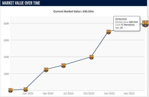 庫巴西出自于巴薩青訓(xùn),2023年從青年隊進入巴薩一線隊時,他的身價只有150萬歐。但兩年間他得到了長足的進步,展現(xiàn)了充分的潛力,身價已經(jīng)暴漲到如今的8000萬歐。